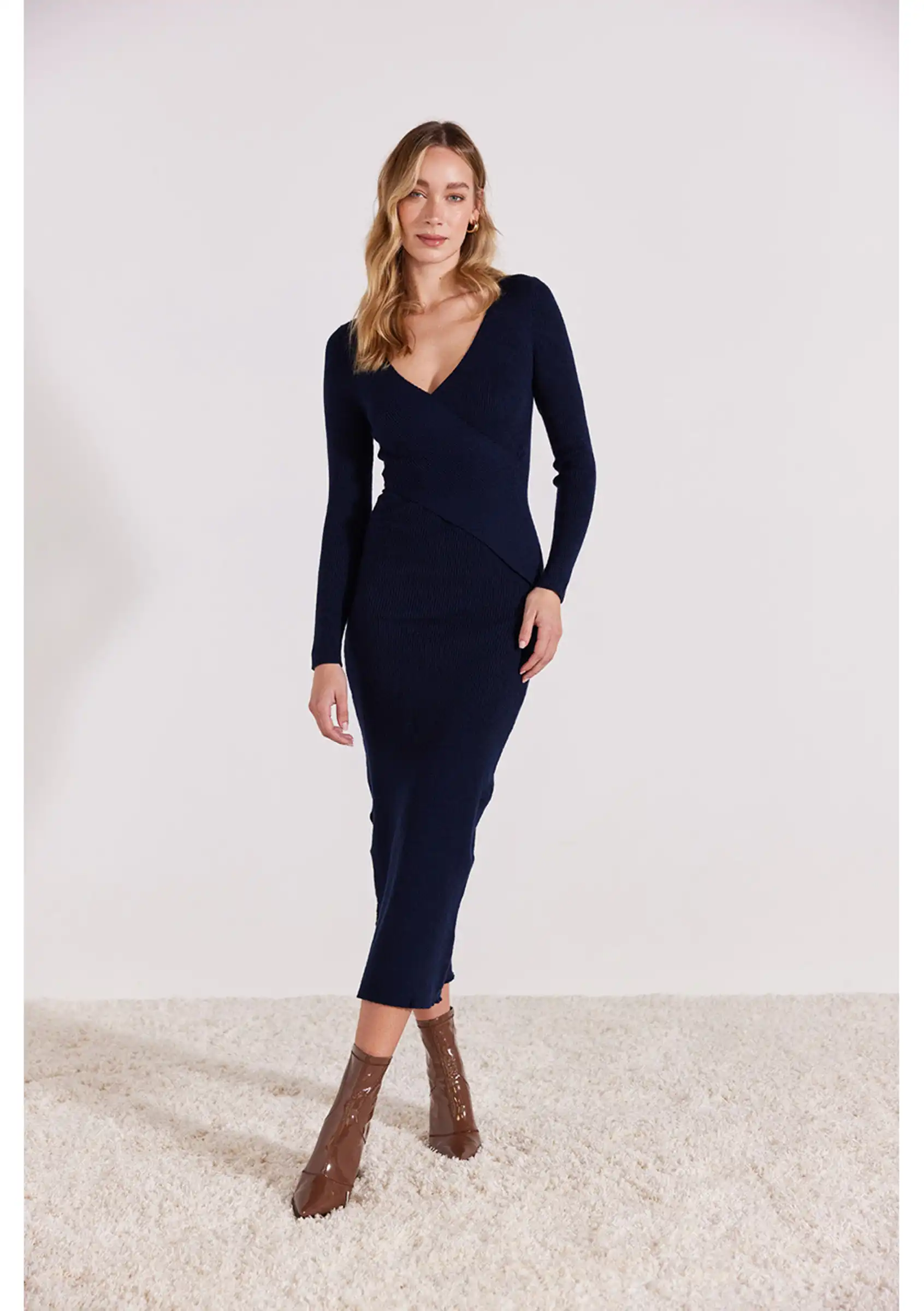 Navy stretch rib knit fitted midi dress- V-neck- Faux wrap front detail- Full-length sleeves- Midi length