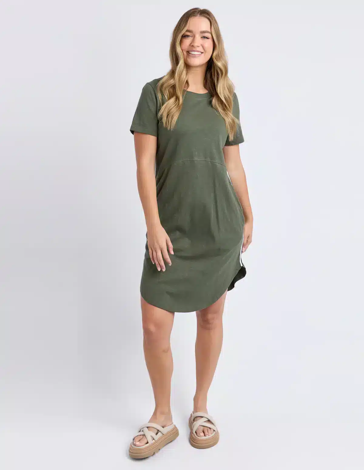 This Bay Tape Dress in Khaki combines a flattering knee-length design with short sleeves for effortless style. The side tape detail enhances its silhouette, while the curved hem adds a modern touch. Perfect for day or evening wear, it offers both comfort and chic appeal
