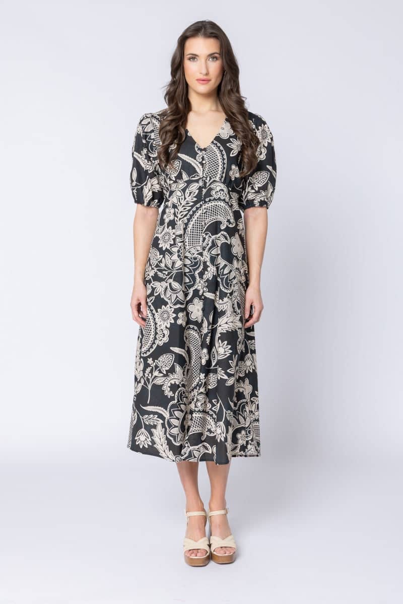 Embrace effortless elegance with the Seeking Lola Cheerful Dress in the sophisticated Sand Flower print. This midi-length dress combines a timeless silhouette with a striking print, making it the perfect statement piece for any occasion.