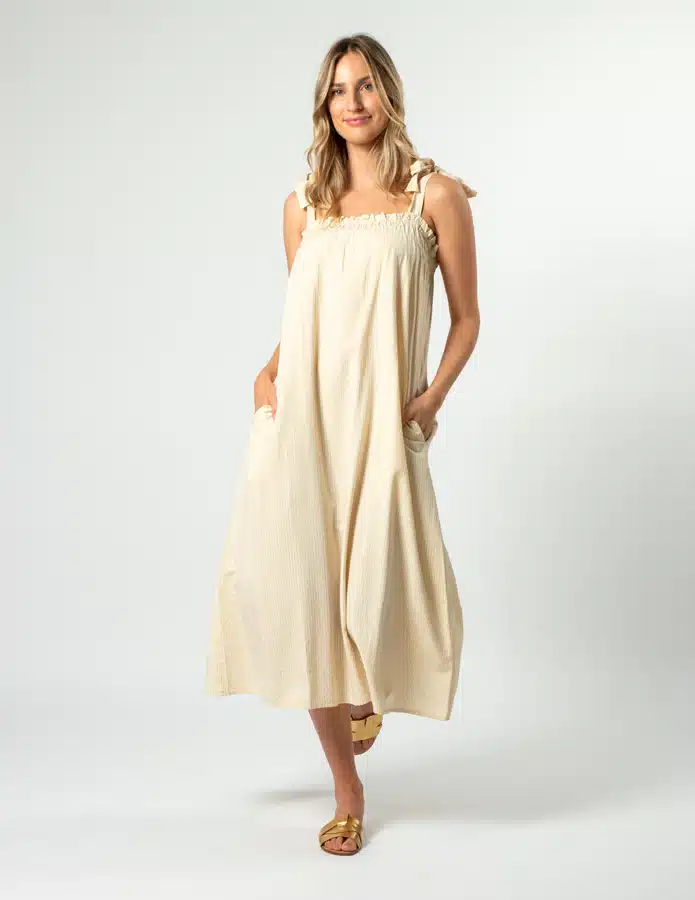 Tie shoulder sundress with elastic through bust and frill on edge. Self stripe fabric