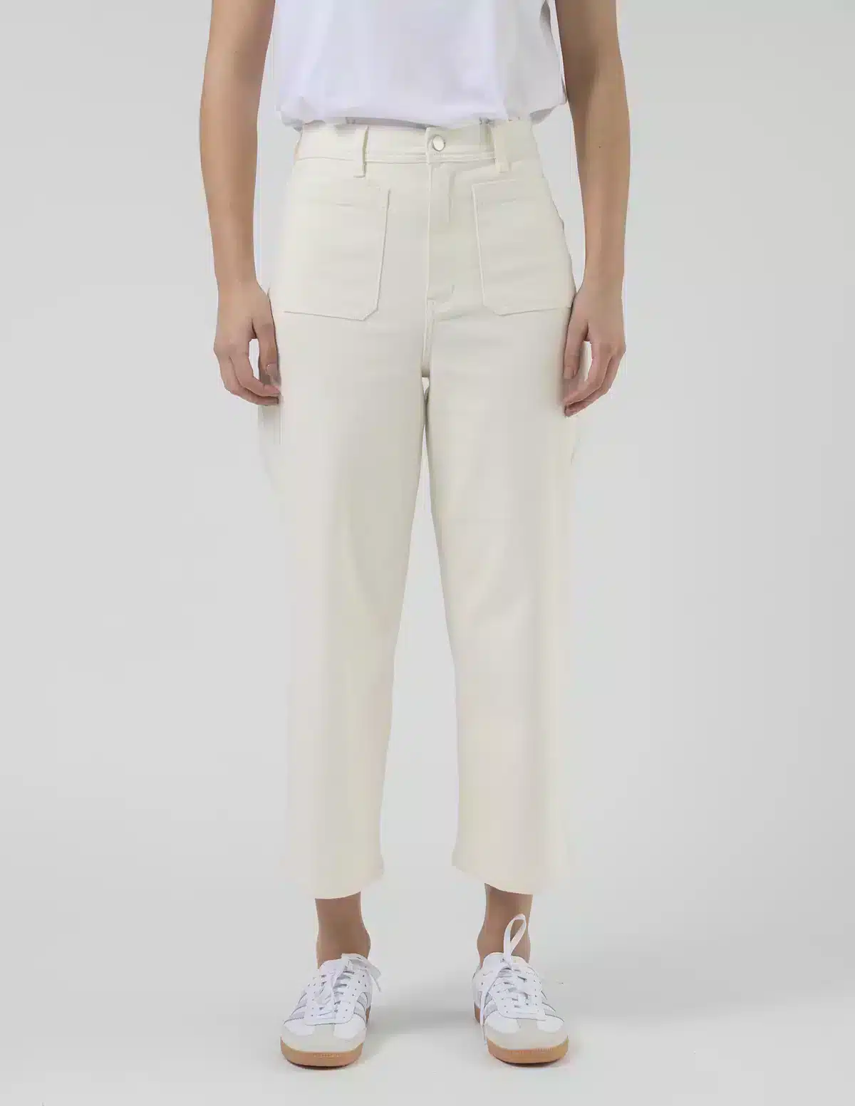 Wide leg cropped jean with front patch pockets and back pockets. Logo patch on back waistband.