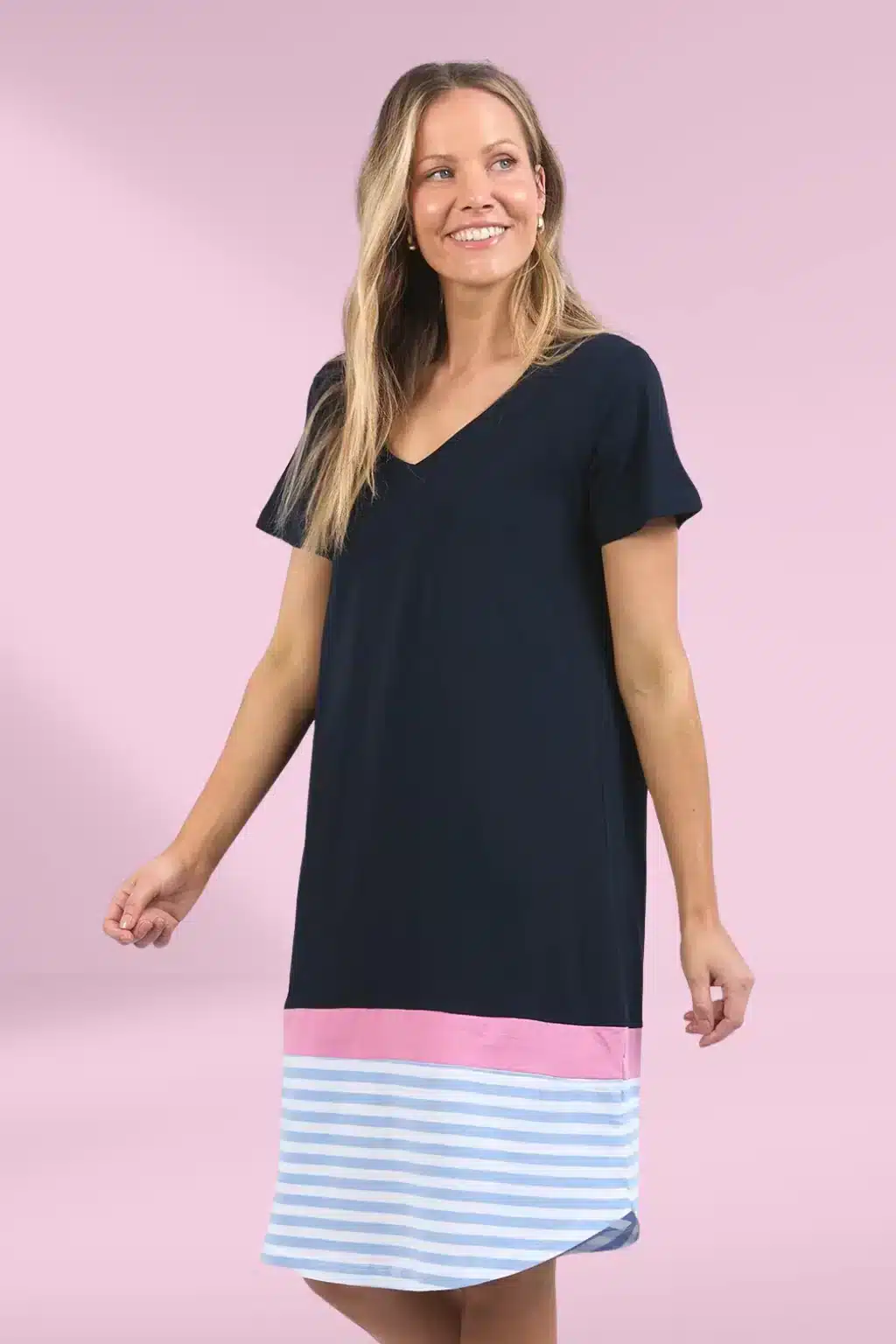 Fun Comfort In 100% Cotton. The Draw The Line Tee Dress From Elm Features Short Sleeves, A Flattering Curved Hem And Bold Colour Pop Stripe At The Bottom For Extra Fun!