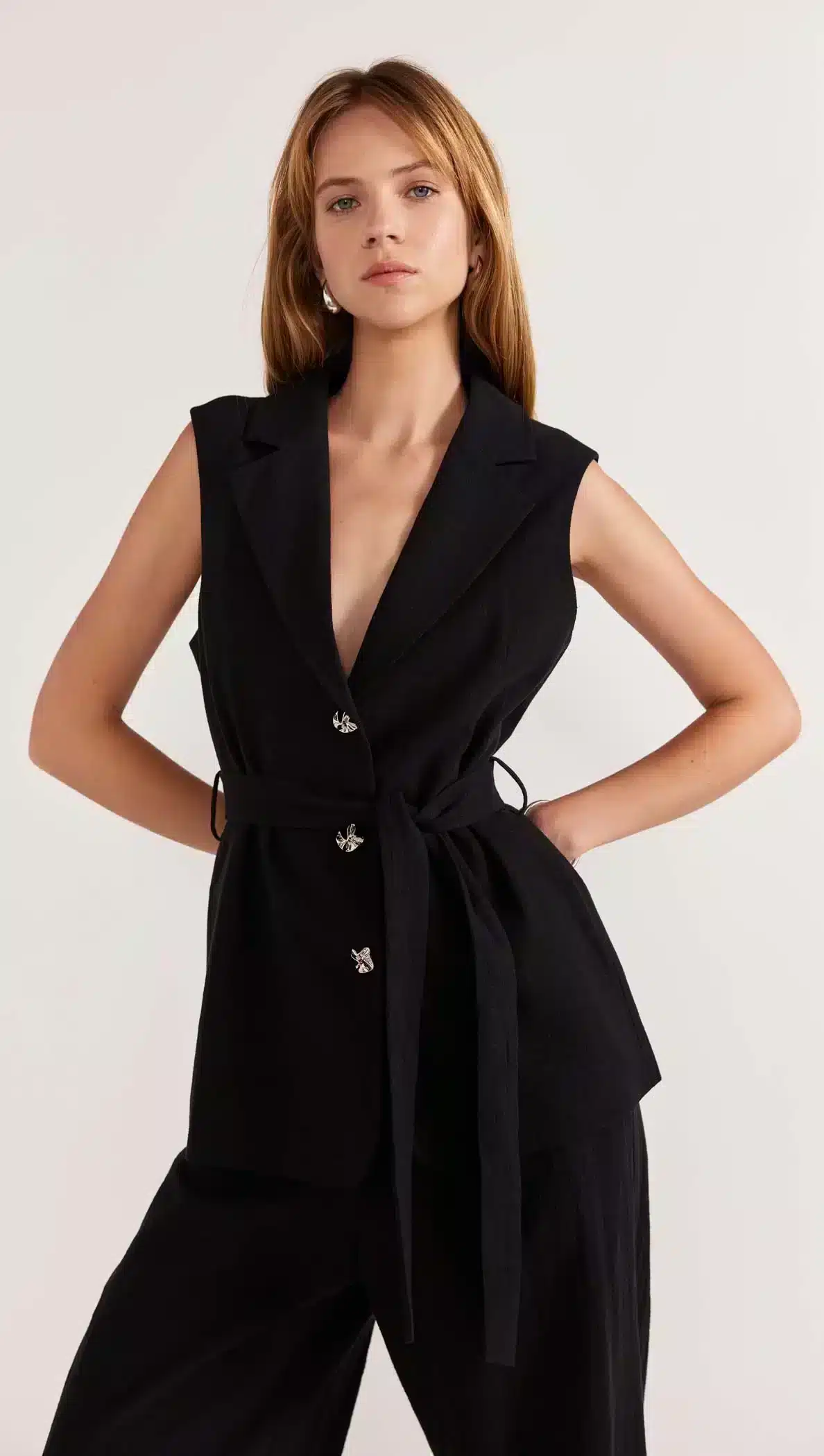 Simple yet chic featuring sculptural silver buttons that make this not just your average black vest. Style with our matching Harper Wide Leg Pants to complete the set or use as a layering piece over a long sleeve basic tee and jeans.