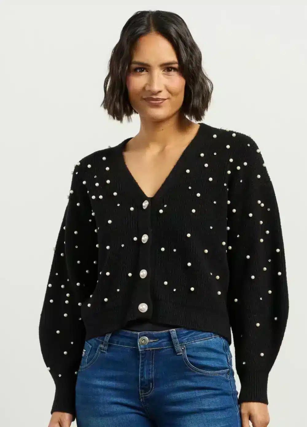 Elevate your everyday style with this effortlessly chic, slightly cropped knit cardigan. Crafted from soft fabric, this versatile piece offers the perfect balance of comfort and sophistication. The timeless, knit design flatters your figure, while the delicate pearls, stitched across the body and sleeves, add a touch of elegance and glamour.