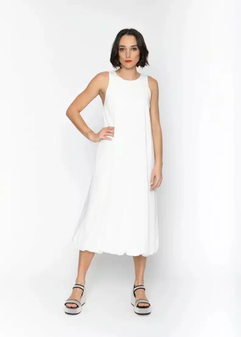 The Rosa Dress has a fitted torso with a relaxed A-line skirting and side pockets. This breezy and lightweight dress is designed to elevate your style with its elegant subtle puff hem line.