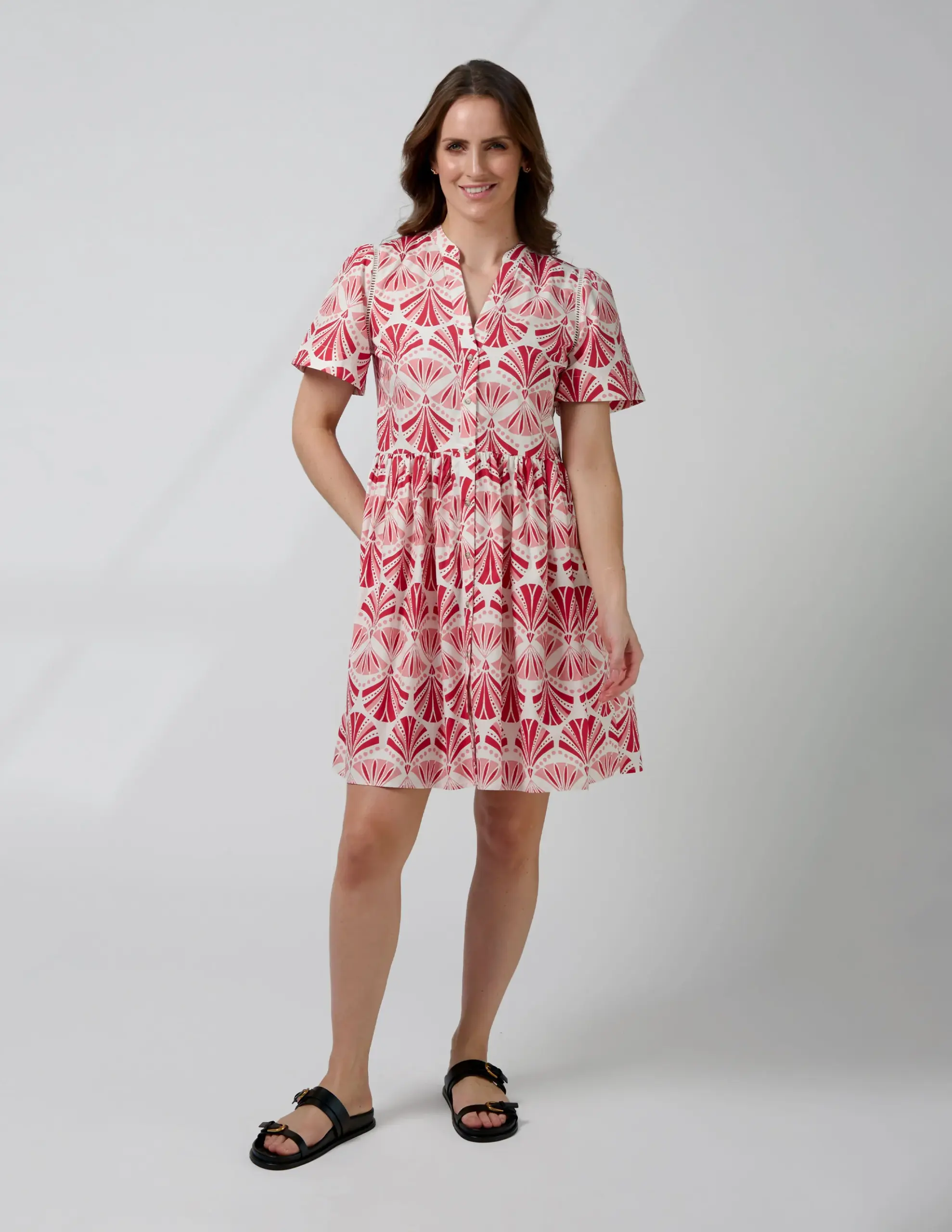 Knee length V Neck button front tiered dress with fluted sleeves and ladder stitch detail through armholes