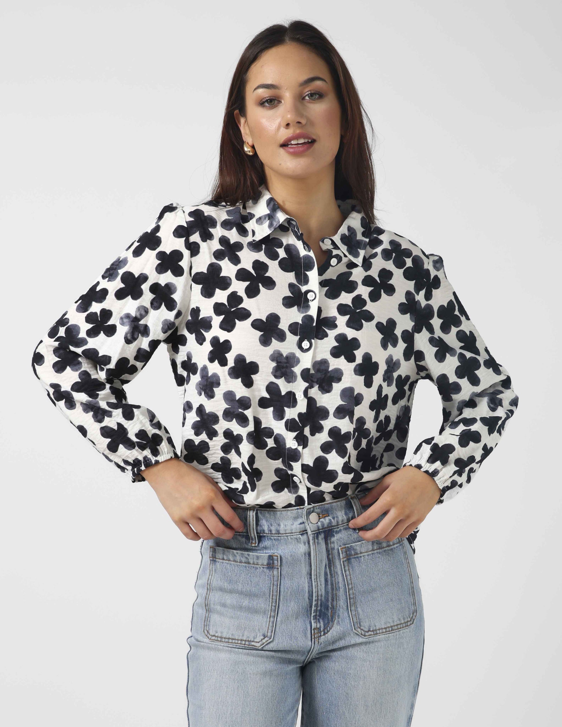 Relaxed fit shirt with collar, button front and elasticated cuffs.