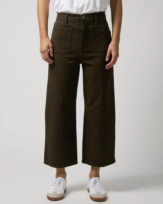 Wide leg cropped jean with front patch pockets and back pockets. Logo patch on back waistband.