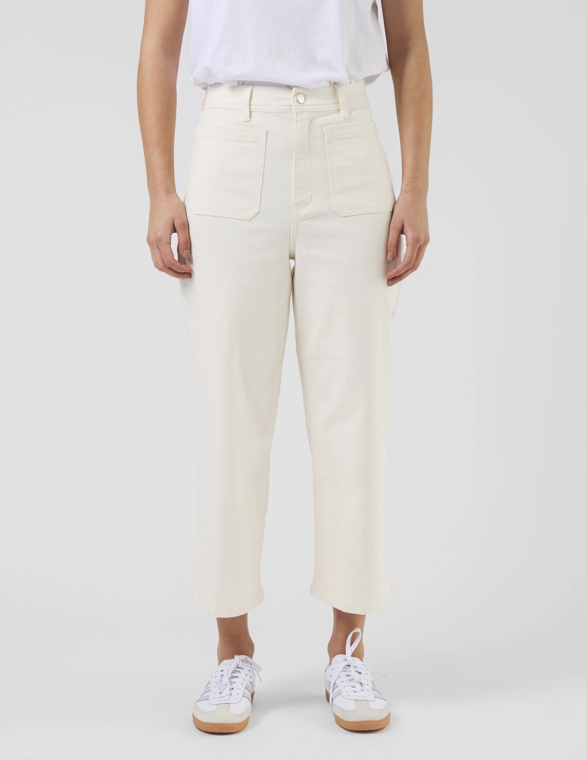 Wide leg cropped jean with front patch pockets and back pockets. Logo patch on back waistband.