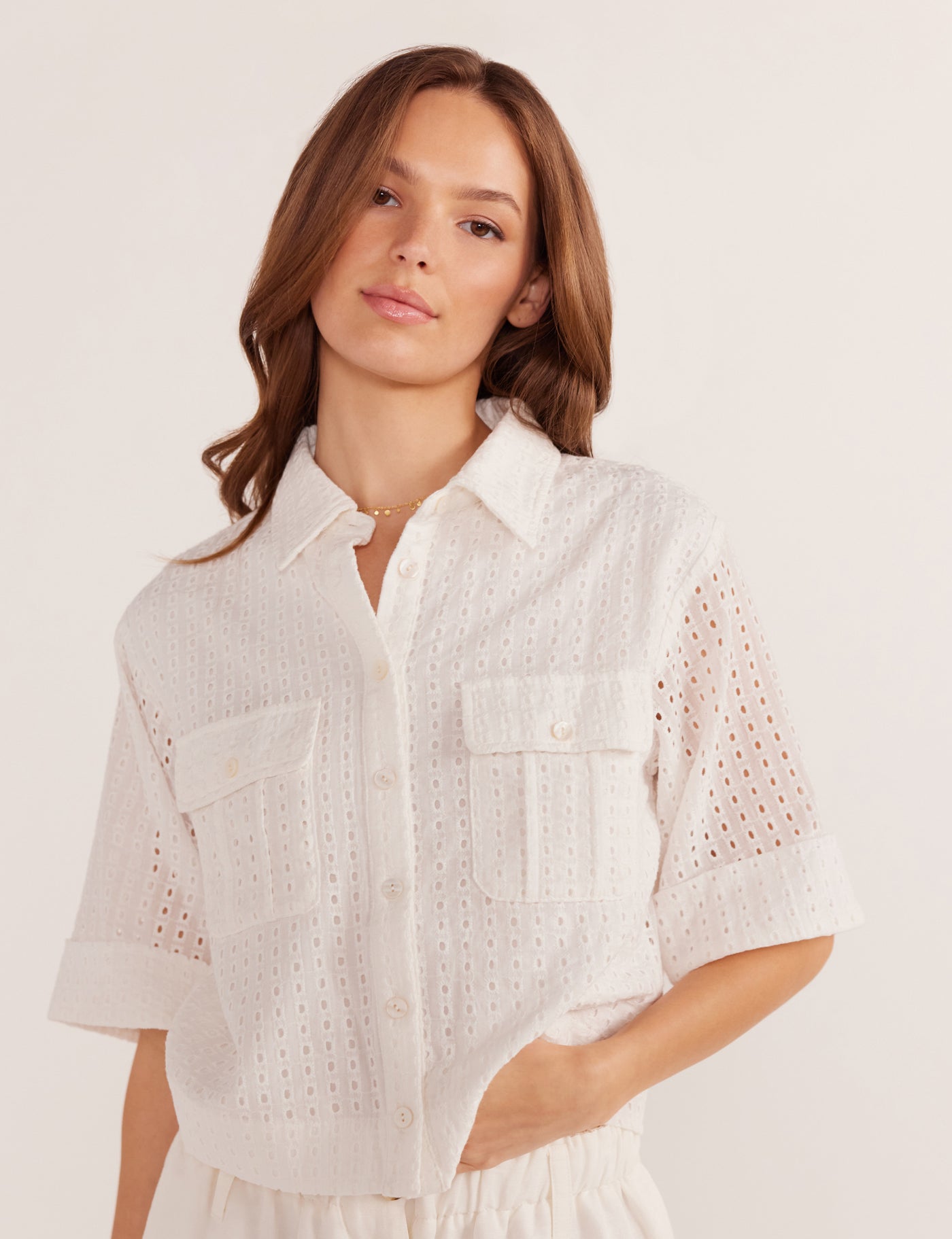 As sweet as a button, the Minkpink Frida Broderie Crop Shirt will match back perfect with a lovely denim skirt.