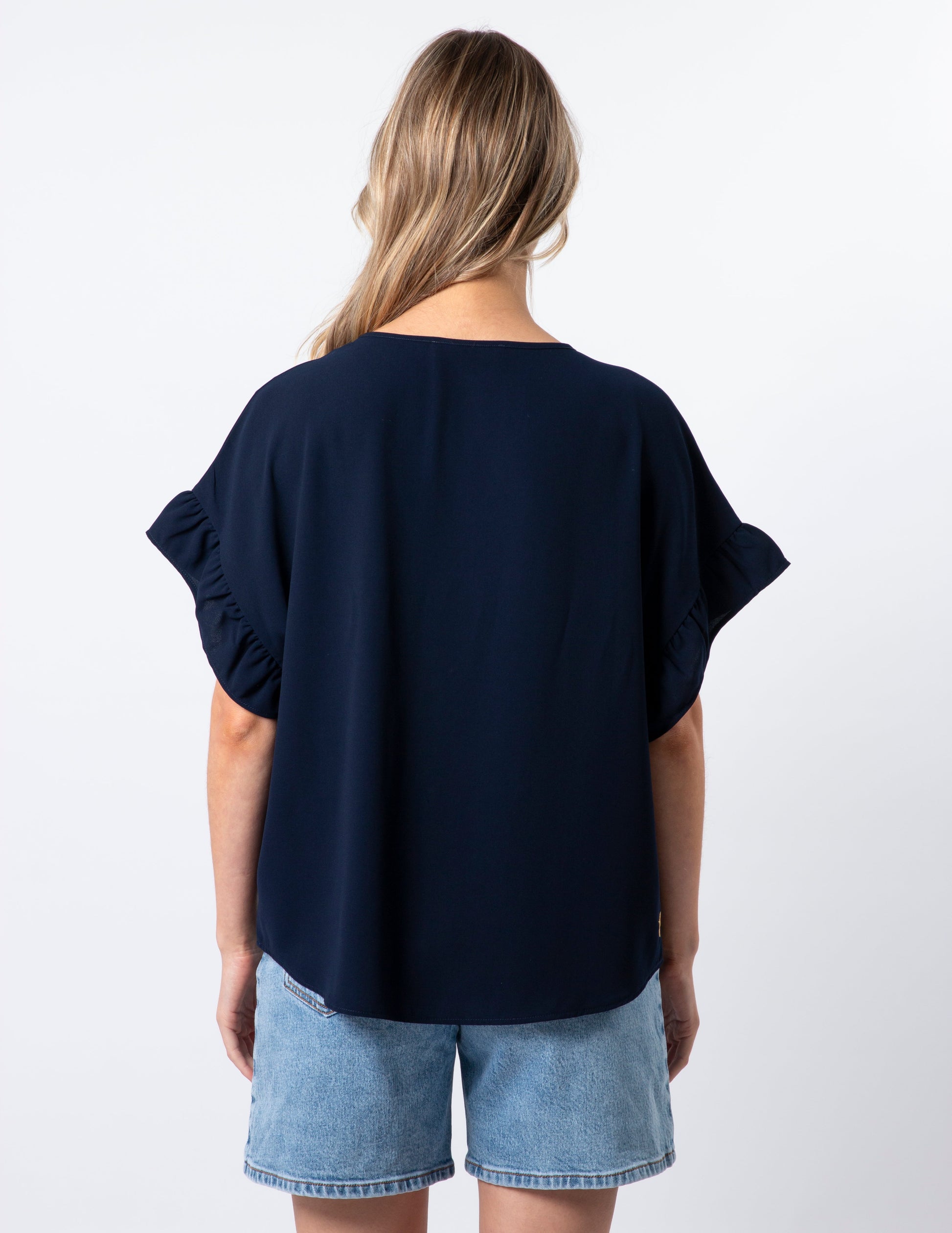 Crew neck blouse with dropped shoulder, frill cuff sleeve.