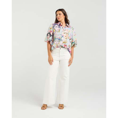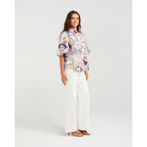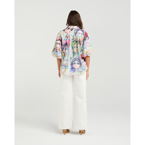 This Frida Kahlo inspired button up blouse with elbow length sleeve and subtle pleats adds drama and a feminine silhouette. Perfect for adding flair to a creative wardrobe.