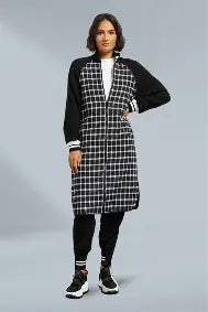 A cool look for casual style with a sports-luxe edge, this longline cardi features woven plaid fabric on the front and back with sweat shirting knit on the sides and sleeves, all finished with stripe rib bands. Perfect for weekend dressing.