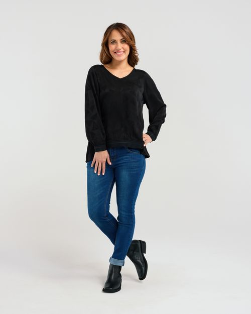 This sleek black top combines comfort and style with its relaxed fit and flattering V-neck design. The long sleeves provide a cozy look, while the longer back adds a modern touch. Elastic trim detailing at the cuffs and hemline gives it a polished finish, offering both flexibility and structure. Perfect for layering or wearing solo, this versatile piece is an essential addition to your wardrobe for any casual outing or laid-back day.
