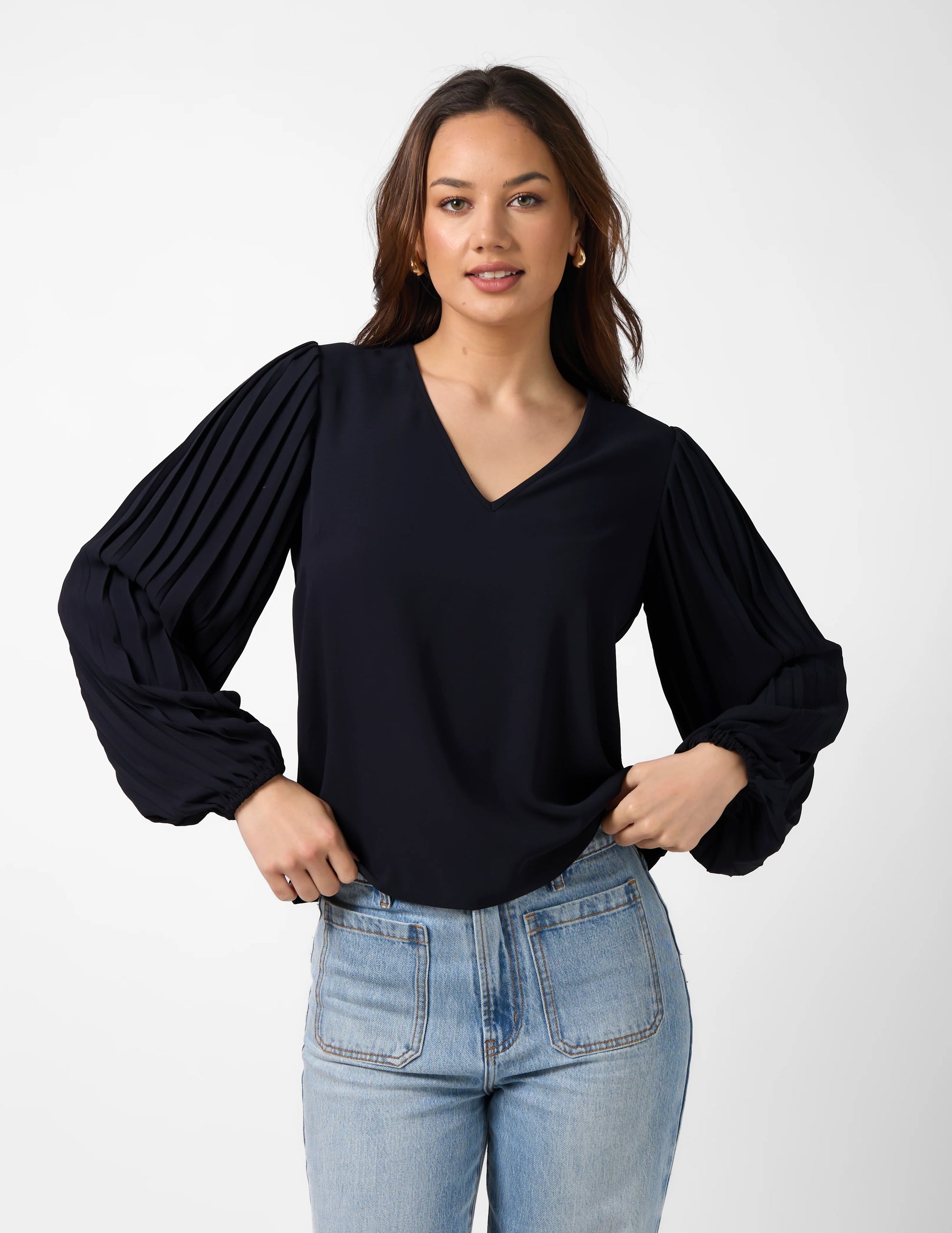 V Neck blouse with pleated sleeves and gathered elasticated cuff. Back hem logo embroidery.