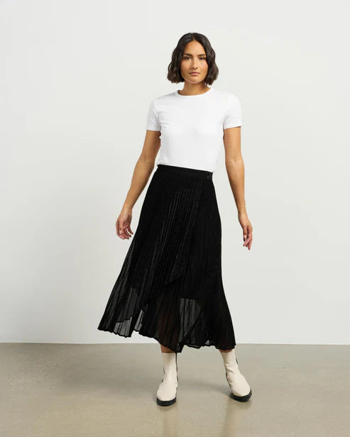 Expertly designed with a pleated wrap front and shaped hi-lo hem, Sawyer Skirt is a must-have. Fully lined for comfort. Elasticated back and side zip for a classic fit. Perfect for any occasion. Midi length adds sophistication.