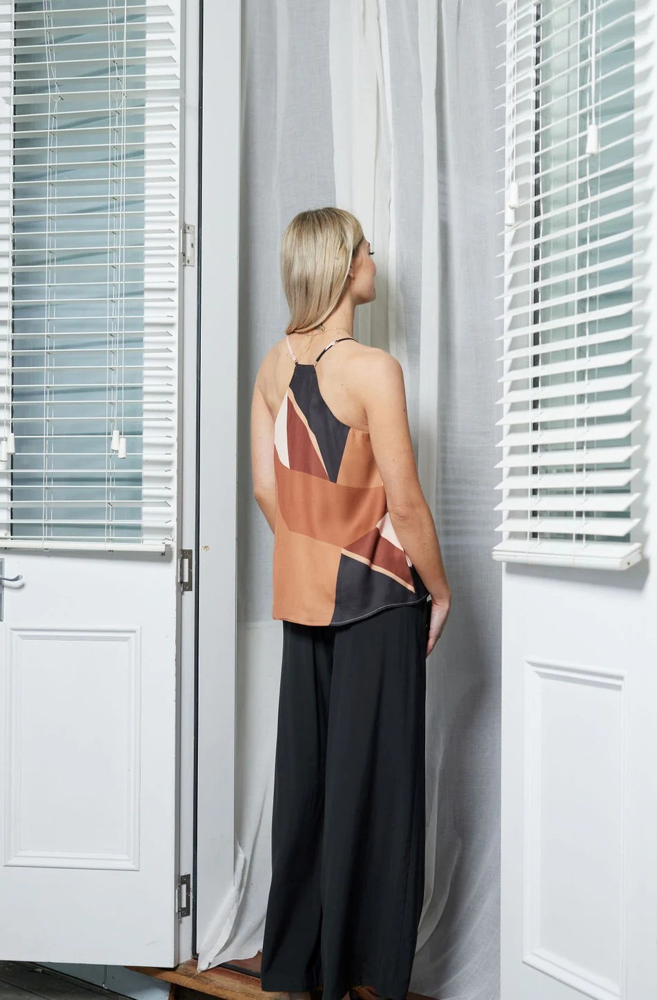 V-Neck Swing Cami with Racer back and adjustable straps, fully lined. Super cool 70's Vibe Print with colours of pink, brown, cream and black.